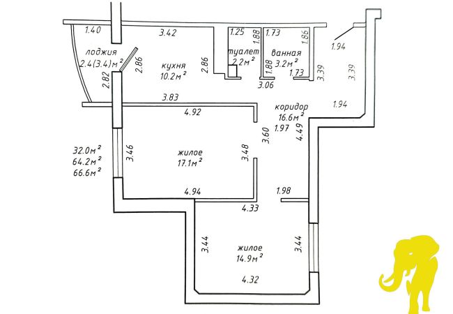 площадь: 66,6/64,2/32/10,2 кв.м.