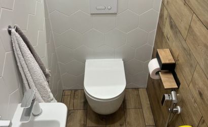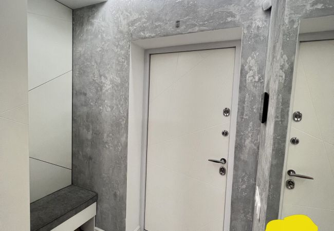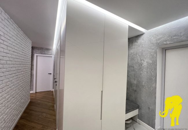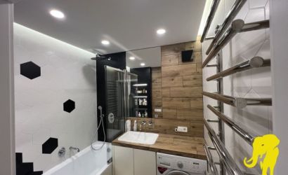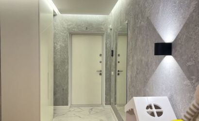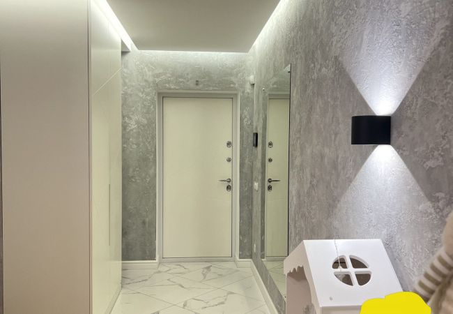 • Дизайнерский ремонт: Потолки с парящим эффектом из влагостойкого гипсокартона, окрашенные премиальной краской от Caparol, создают ощущение легкости и простора. Стены оштукатурены и оформлены дорогим декором от производителя Oikos.
